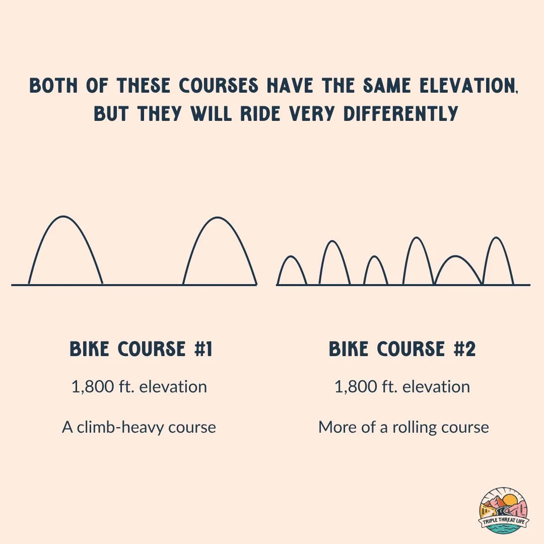 Let’s use Augusta 70.3 as an example. There’s 1,800 ft. of elevation on the 56-mile bike course. Nothing too terrible. But you have to look at the course map to see where and how that elevation occurs.